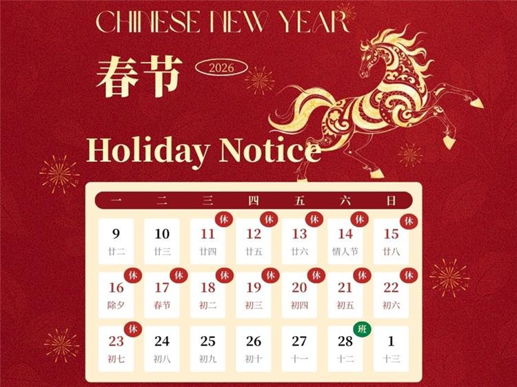 As the Spring Festival of 2026 approaches, we would like to thank you for your continued trust and cooperation sincerely. Please kindly note our holiday arrangement as below: